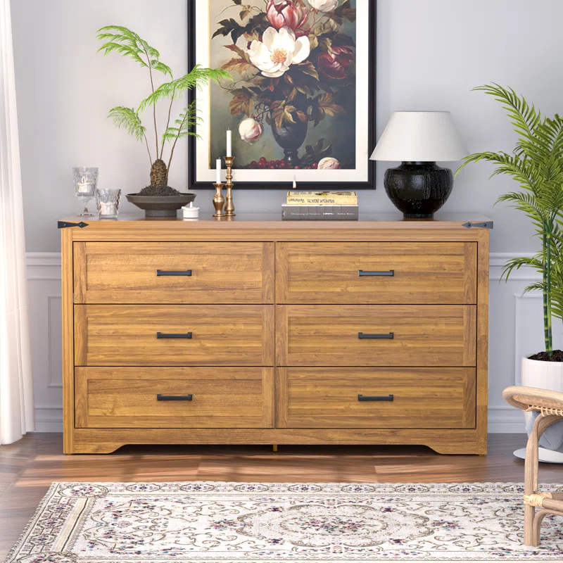 دولاب 6 أدراج مزدوج يعزز لمسة من الجمال الريفي والروح الريفية في غرفتك أو مساحتك المعيشية. تم صنعه من الخشب المعالج الثقيل مع لمسة نهائية ناعمة، ويتمتع بتصميم مميز مع سطح علوي خشبي بني ريفي سميك مع إشارات أسهم حظيرة سوداء في كل زاوية. كما أن كل درج مزخرف بنقوش يدوية فريدة ومزود بمقبض أسود بشكل كوب، مما يعزز من سهولة الوصول إلى الأدراج ويضيف لمسة جمالية نظيفة. يوفر الدولاب مساحة كبيرة لتنظيم الأغطية الإضافية، القمصان، السراويل وغيرها من مستلزمات الملابس. يمكن أيضًا تحويل السطح العلوي إلى مرآة أو عرض مصباح طاولة وبعض الصور المعلقة. يحتوي الدولاب على قاعدة صلبة ومتينة مع هيكل مضاد للسقوط للحفاظ على أمان عائلتك. يعد هذا الدولاب الاختيار المثالي للمساحات الأنيقة والمرتبة، وهو مزيج مثالي من الأسلوب والوظيفية لمن يقدرون الجمال الريفي.