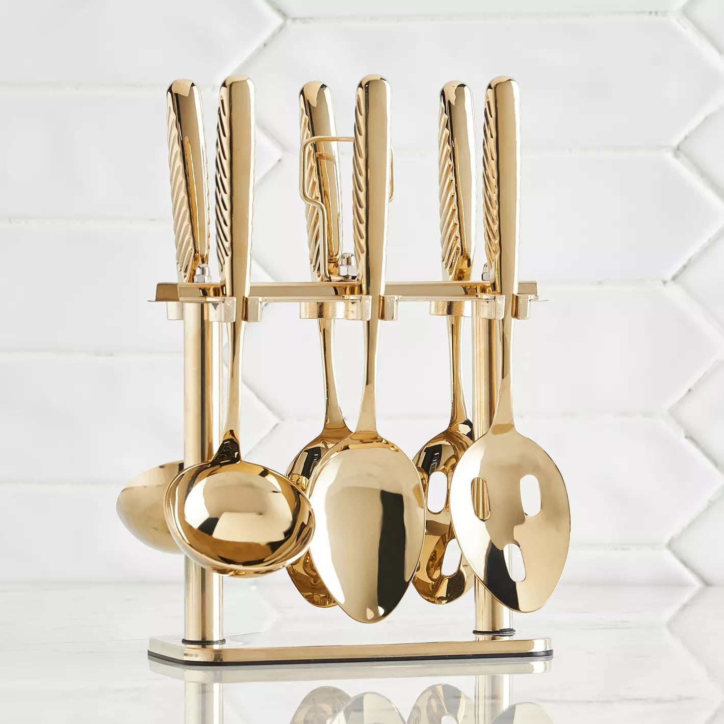 اجعلي طاولة الطعام تنضح بالأناقة والعملية باقتناء هذا الطقم المميز المكوّن من سبع قطع متنوعة. يشمل مغرفة، ملعقة، ملعقة بفتحات، بالإضافة إلى حامل أنيق يساعد في تقديم الأطباق المتعددة بسهولة وتنظيم. مصنوع من الستانلس ستيل المقاوم للصدأ، يتميز بالمتانة وسهولة التنظيف، ويُعد خيارًا لا غنى عنه لكل منزل يهتم بالتفاصيل الأنيقة على الطاولة.